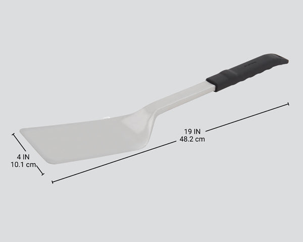 This stainless steel BBQ grill turner features a semi-flexible blade that effortlessly scoops and lifts foods from the grill. The hard resin handle provides a comfortable, secure grip, while the strong stainless steel blade ensures reliable performance. Its box-shaped shaft adds exceptional strength and rigidity, making it a dependable tool for all your grilling needs.